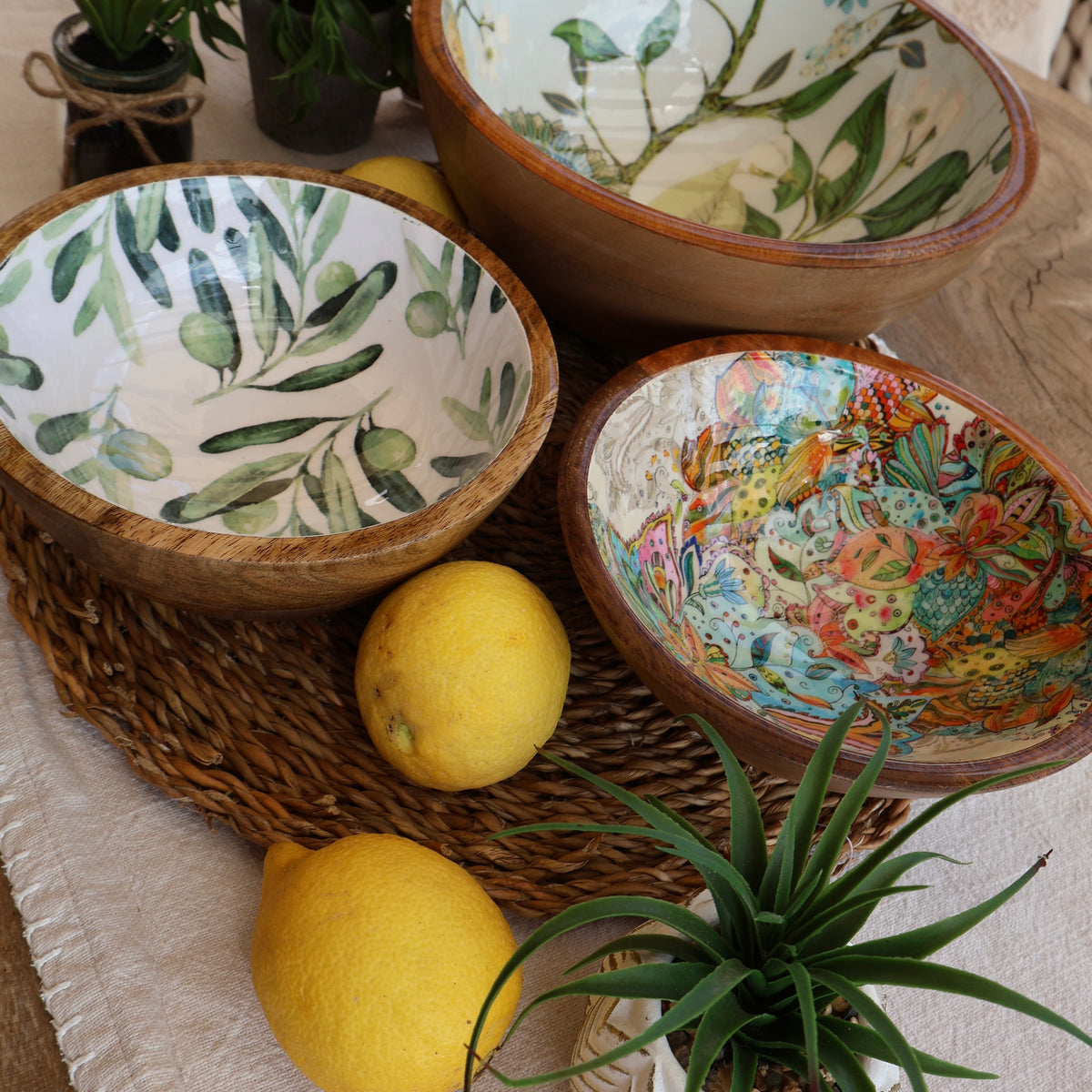 Handgemachte Schalen aus nachhaltig angebautem, schnell wachsendem Mangoholz mit wunderschönem Lemon Bird Print.
