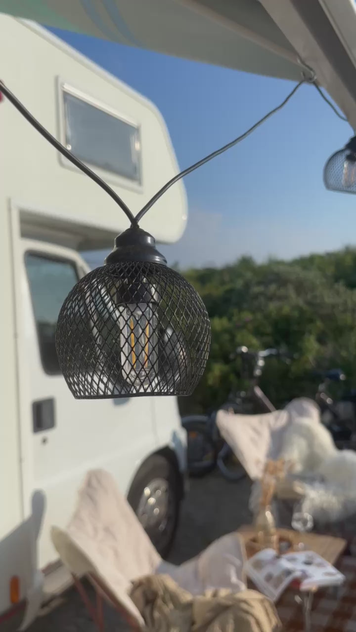 Die Solardekoration Sunlight ist eine Lichterkette mit acht Dekorationen aus Metallgeflecht, die mit Glühfaden-LEDs beleuchtet wird, die in einem warmweißen Licht leuchten.